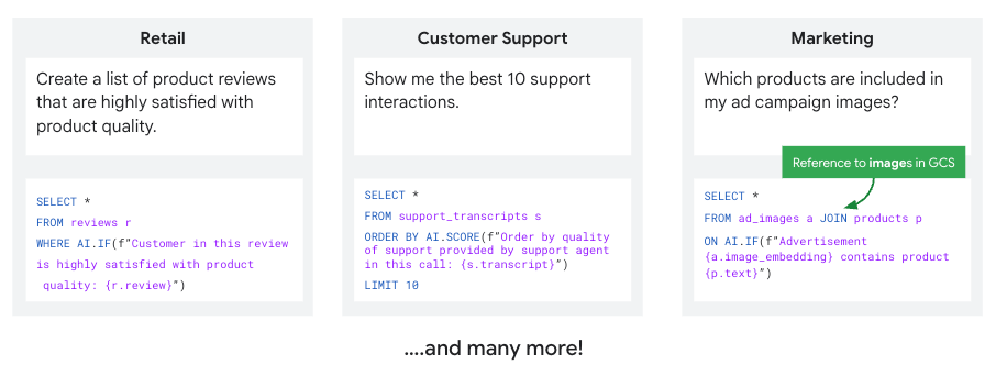最後,在這個統一且易於存取的數據之上,Google Cloud將AI推理能力直接嵌入用戶的查詢引擎中。透過BigQuery全新的AI查詢引擎 (AI Query Engine;預覽版) ,所有數據員都能在BigQuery內部直接對結構化和非結構化資料執行AI驅動的運算,快速且輕鬆地獲得主觀問題的答案,例如:「這些客戶評論中,哪些看起來最為不滿?」