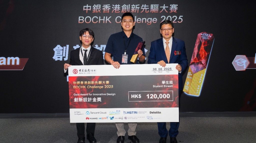 中銀香港副董事長兼總裁孫煜(右一)頒授「中銀香港創新先驅大賽2025」創新設計金獎予學生組得獎隊伍。
