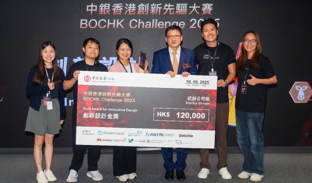 中銀香港副董事長兼總裁孫煜(右三)頒授「中銀香港創新先驅大賽2025」創新設計金獎予初創組得獎隊伍。