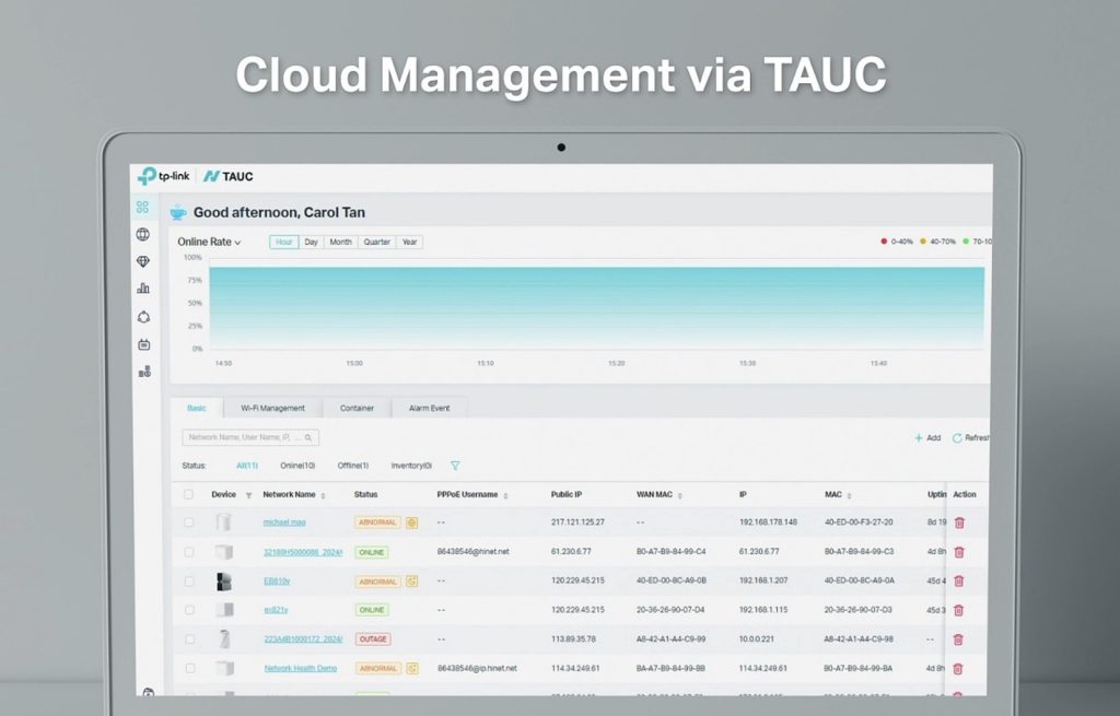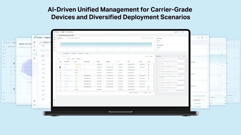TP-Link的Wi-Fi 7解決方案平台Aginet,專為網絡服務供應商 (寬頻公司) 提供的統一管理路由器系列,結合Aginet Unified Cloud統一雲端管理系統 (TAUC),能夠實時監測和管理路由器,主動偵測用戶Wi-Fi網絡健康狀況,當發現網絡異常,便可通過雲端管理平台即時進行遙距診斷及修正,無需額外上門檢查。為用戶提供更高速、更穩定的網絡連接,確保用戶享受無縫的網絡體驗。