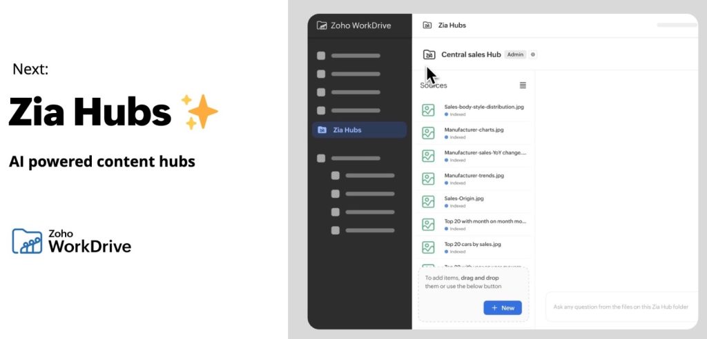 Zia Hubs是整合於Zoho WorkDrive中的一項創新解決方案,將非結構化業務數據接入公司豐富的應用生態與AI服務中。該功能使企業能夠將多種格式的業務內容,無論其內容為甚麼類型與結構如何,都能直接對接至Zoho強大的智能化服務,包括代理式AI (agentic AI)、綜合分析能力以及精準的統一搜尋。