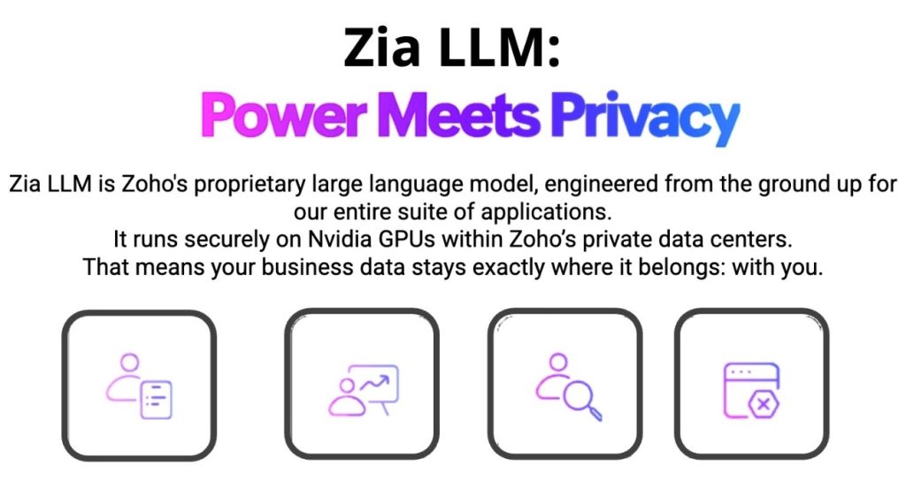 儘管Zoho現已支援並整合多種主流的大型語言模型 (包括ChatGPT、Llama及DeepSeek),Zia LLM的推出可讓客戶能夠在完全保存數據於Zoho伺服器的前提下,安全運用最先進的AI功能,無需將任何資料傳輸至外部AI雲端服務供應商。