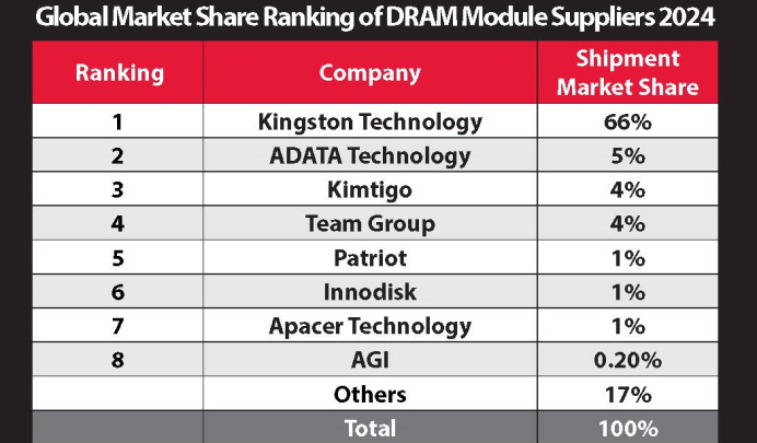 Read More記憶體與儲存品牌金士頓近日宣布,再度榮獲記憶體模組品牌全球市佔第一位。研調機構TrendForce指出,儘管2024年下半年消費性需求疲軟,使金士頓營收成長相對放緩,但據TrendForce公布的最新營收排名,金士頓以高達66%市佔率,連續22年蟬聯全球記憶體模組龍頭寶座。2024年全球記憶體模組市場整體營收年增幅達7%,成功扭轉前一年的下滑趨勢。