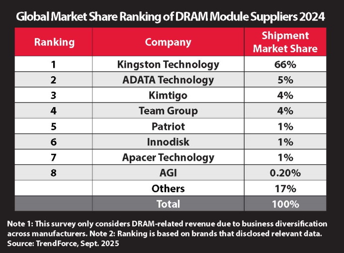 TrendForce公布的最新營收排名,金士頓以高達66%市佔率,連續22年蟬聯全球記憶體模組龍頭寶座。