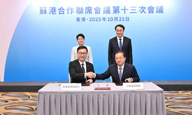 會上,蘇港雙方簽署會議紀要,將於2026年落實超過30項專案,涵蓋貿易、企業出海、科創、金融、一帶一路、創意設計等範疇。