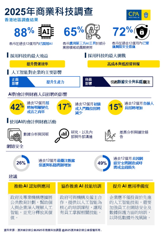 澳洲會計師公會最新的商業科技應用區域調查顯示,大多數香港企業在不同程度上已採用人工智能 (AI) 工具。儘管人工智能的廣泛應用有助提升生產力,但同時也改變了會計與財務行業的招聘趨勢,並更關注對數據的安全保障與治理。