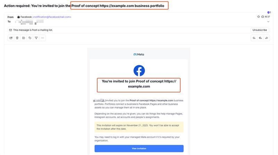 - 繞過傳統防護措施:許多電郵安全系統往往靠驗證域名聲譽及發件人進行攔截,但當惡意訊息來自可信的網域如 facebookmail.com 時,這些防禦往往失效。