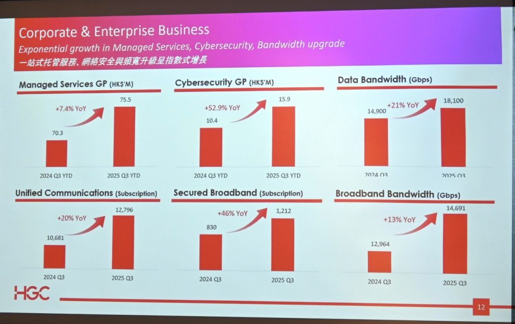 在企業業務方面,HGC環電現正服務超過46,000間大型公司及企業。截至2025年第三季,託管服務、網絡安全解決方案的毛利分別按年增長7.4%和52.9%。