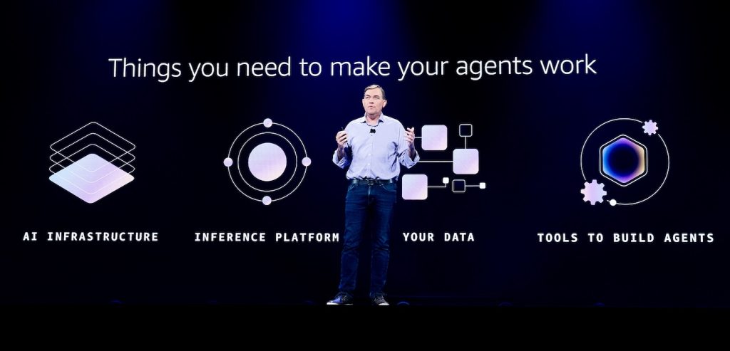 Matt Garman闡述了建構AI Agent所需的四大要素:AI基礎設施、推論系統、資料、Agent建構工具。