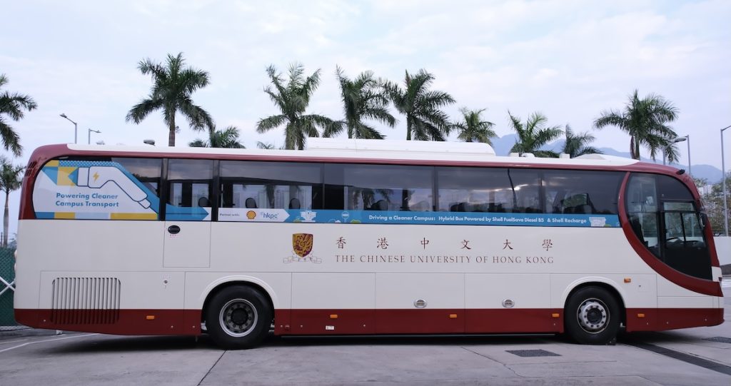 香港蜆殼有限公司 (Shell) 與香港中文大學合作,啟用設置於校園內的Shell Recharge電動校巴充電站,配備兩部功率達120千瓦的快速充電機,為中大逐步引入的新能源校巴提供高效能源補給。同時,香港生產力促進局為中大提供首部香港校園內的混能巴士 ,這是本地大學校園首次採用混能校巴作為低碳交通方案。